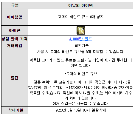 던파 2023년 7월 이달의 아이템 '고대의 바인드 큐브 8개 상자'